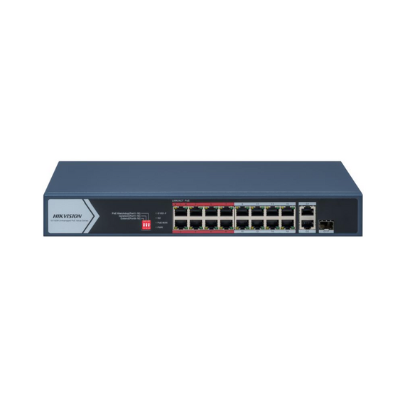 L2, Unmanaged, 16 10/100M RJ45 PoE ports, 1 Gigabit RJ45 port, 1 Gigabit combo port, 802.3af/at, PoE power budget 130W, ports 9-16 support up to 300meter, 6KV surge protection