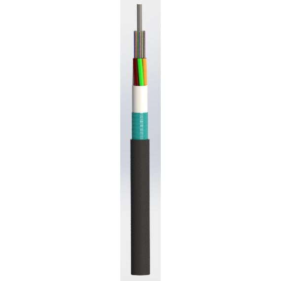 Loose tube construction, tubes jelly filled, elements (tubes and filler rods) and water blocking yarns laid up around metallic central strength member, polyester yarns used to bind the cable core, water blocking tape, then steel tape and LSZH outer sheath